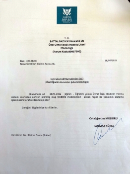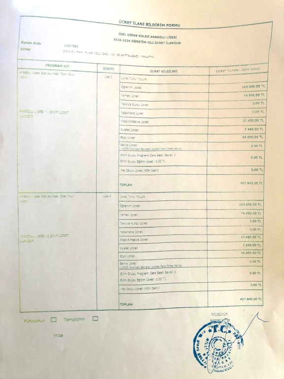 Girne Koleji Malatya Kampüsü Anadolu Lisesi 2025-2026 Dönemi Ücret İlanı